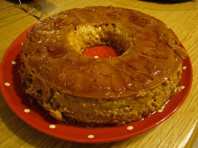 segurei com o pano de tirar coisas do forno a forma do pudim na trempe do fogão, pus 3 colheres de açúcar e esperei derreter e dar uma corada. Depois joguei amêndoas fatiadas e reservei.